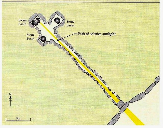 Overhead diagram of Newgrange passage and solstice light. (Irish Art History Section, Professional Development Service for Teachers, P.D.S.T., Ireland)