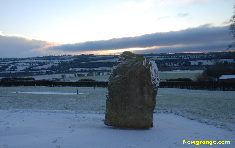 A cold snowy morning at Newgrange with a bank of cloud on the eastern horizon